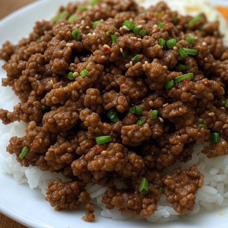 - Ground beef bulgogi, topped with scallions and sesame seeds.